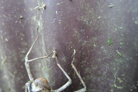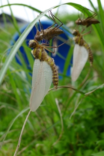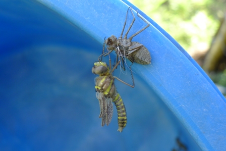 ヤゴがトンボへと脱皮するのに必要なこと。池から上がったヤゴは高いところへと移動をはじめる。これは脱皮をしたヤゴが羽を伸ばし体がトンボへと変わるための場所、洗濯物を干すように体を干す場所がいるためだ。体が綺麗に伸びるためには障害物が当たらないぐらい高い場所、そして角度は90度以上がいいようだ。風があると落ちてしまうし、暑すぎてもいけないようだ、やや陰干しで時間も大切なようだ。草に登って脱皮は自然な姿、でも200L樹脂製の容器も表面がザラザラしていて登りやすかったようだ、でもトタンの壁は駄目だ、登ろうと一生懸命手を空回りさせていた。気がかりだった、もし草を刈ってしまったら脱皮の場所がなくなってしまう。だから脱皮が一段落して終わったのを見計らって草を刈った。ところが翌日登れないはずのトタンの壁で脱皮をしているヤゴをみた、、、よくみると刈り払い機で払った草がトタンの壁にへばりついていた、ロッククライマーさながらほんの小さな手掛かりの存在がヤゴの運命を握っていた。そして昨日まで登れなかったトタンの壁でトンボになり無事旅立っていった。