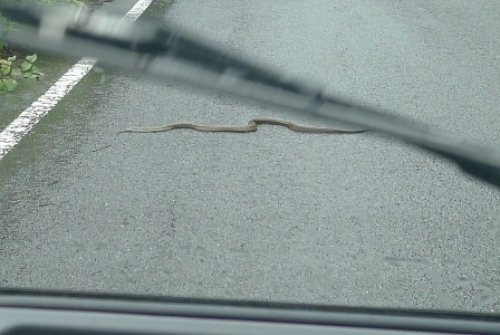 田舎道を車で走っているとよく出会う光景のように思います。でも実際あまり見ないです、そういう光景があったんだろうなという場面にはあいますがね。ヘビが道路を横断していました。近づくと慌てる素振りをみせたものの車が止まるのを確認すると悠然と渡って行きました。アオダイショウ、サイズは結構でかいなぁ、1.5mぐらいか?出会うとマジマジと鑑定するのが習慣となっています(^.^)。