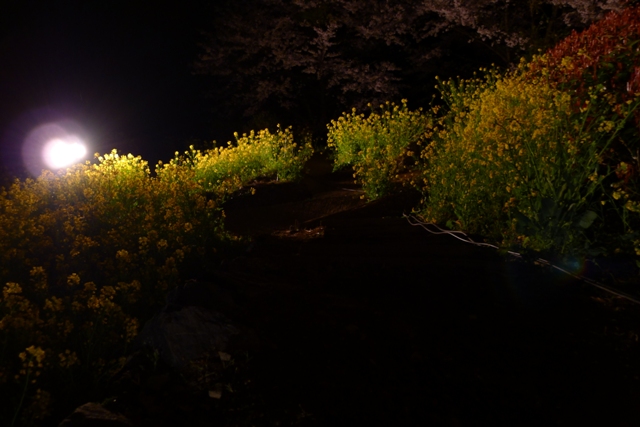 「夜はライトアップされています。」この町内放送の誘いにのって桜を見に行った人ってどのくらいいるんでしょうね。アタシらは、その気になって見に行きました。初めての夜間ドライブ、go to Nakastu.です。正直、フォグランってこういうのためにあるんだなぁって思いました。現地では、一眼レフもって本格仕様で撮影していましたね。残念ながら夜桜を見ながら一杯はありませんでしたが、負け時と撮影しました。手持ちコンデジでプロの意地みせたる(実名で検索すると結構あたる。)。とりあえず、菜の花です。菜の花と桜のコラボ。キャメラマン。夜風に揺られて。枝っぷりが男前やねぇ。まっ、この辺にしといちゃるか、、、(1秒露出さすがにブレるわい(;´Д`))あまり綺麗に撮れなかったので撮影場所はないしょ|:3ミ今度は昼がいいな。