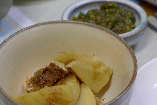 久万高原町は、今朝、雪、みぞれ、アラレ、雨のフルコースでした。すぐに止むと思っていたのですが、意外と天気の回復が遅く、寒々するなか、ウグイスが、これまた寒そうに、発声練習をしていました。これから暖かくなって、明日明後日には、美声を響かせてくれるかな。場面変わりまして。昨夜の夕食には、筍が食卓にのぼりました。愛媛県産ということですが、まだ久万高原町ではできてないんではないかな。奥にあるのはフキノトウの味噌和え、これはうちの畑付近で採ったものです。季節感のある食卓はいいですね。