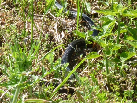 思わず「うぉ。」と声が出ることがあります。山里近い畑はいろんな生物がいて、驚きに満ちていますが、なかでもびっくり大賞はやっぱりこれだわ。草むらに潜んでいることが多いから近づいてもなかなか気づかない、相手が動いて初めて気づくことが多いですね。今回は1mほどのカラスヘビでした。黒って威圧感ありますね、カラスヘビって無毒だと思われているかもしれませんが、ただの色の突然変異ですからマムシの場合もあります。今回はうっすらと体にシマがありましたが、顔はアオダイショウのようでもありました。もう少し観察したかったのですが、残念ながら茂みに入られてしまいました。またお会いしましょう、それではまた(^.^)/~~~