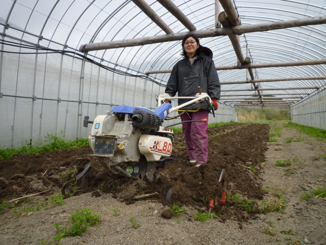 本日、耕す女子たちの2回目の養成講座を行いました。前回は、トラクター、草刈機、畦立機、動噴について学びましたが、今回は、管理機に耕うん爪をつけての登場です。8馬力の耕運機でラクラク耕していますね。このあと畦立機で畝を立てるところまで行いました。