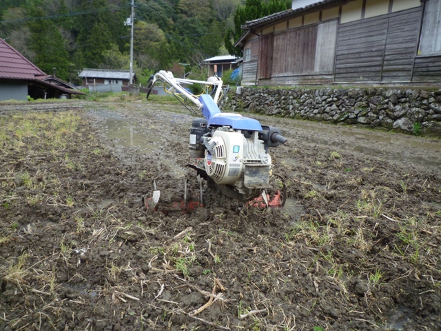田植えをしました。うちの田んぼは山の沢水を引いています。まだ水温も低く田んぼの生き物もイモリとアメンボが泳いでいるぐらい。素足になり田んぼに入る、田の土に埋まっていく足の感触を確かめる、あっ、ここは深いな、ここは石が多いな、日差しである程度水と土が温められるが水口あたりにくると水も土もひんやりとする。かじかむ足を通して田んぼと人がひとつになる。やっぱり、田植えは、手で植える、それが通だろう、、、、さて、チャチャが入る前に、、、私は通じゃないので、、、「さなえ」を借りてきてに植えました♪とても手際よく等間隔に植えていくので、私は後ろをついてまわるだけです。腰をかがめる必要もありません、ただ「さなえ」は足が早いのでついて回るだけで結構いい有酸素運動になります。ダイエットをしたい方はとても有意義に時間を過ごせることと思います(^^ゞちゃんちゃん♪