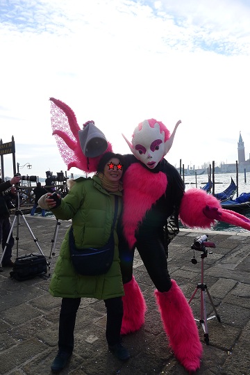 「僕の名前はブーニー。僕はいたずら大好き、お帽子をひょいっと。」(テキトー)んん?、、、、、誰?こちらのアニメキャラ?しかし、うちの嫁、、、得体のしれない生き物に突進していって、この笑顔、さすがは、うちの切り込み隊長。ちなみに、ベネチア、仮面カーニバルでの一コマです、なんでもありですね。もしこの生き物をご存知の方、教えてください。