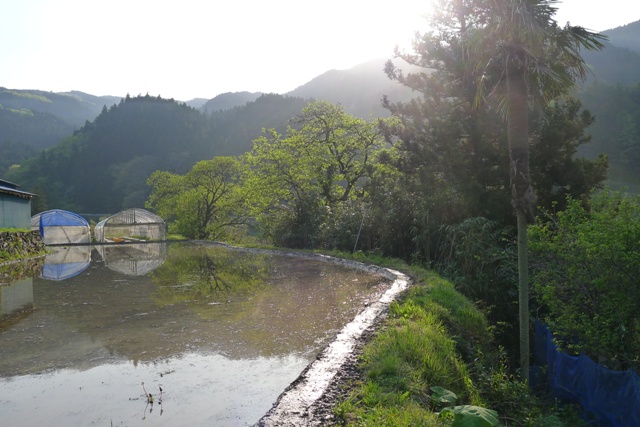 GWともなると久万高原町を縦断する国道は結構交通量が増える、しかし、ひとつ脇道を入るとそこには田舎の風景が広がる。どうせ、田舎へくるならゆっくりと流れるときの流れを感じながらゆっくりと過ごしたほうがいいんじゃない?アマガエルの鳴き声と川のせせらぎを聞きながら、新緑と谷をとおる風が心地よい。機械を使っては騒音ではゆったりとした時の流れが感じられない。やっぱりクワでチャプチャプと田をかき混ぜながら畦塗り作業をする。それが通だろう。今年の初にして最後の作品ができあがった、畦は機能面と自然との調和が大事だ、技術的にはまだまだだが、そろそろ作業に慣れてきたかなというころに今年の創作活動を終える。