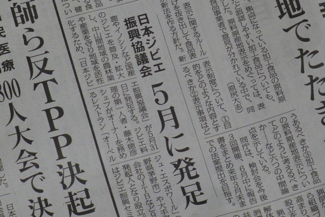 日本農業新聞では、震災以後、除塩、除染、小規模発電なんていうのもよく話題になりましたが、今ではまたTPPの問題が話題になっています。そんな中、ジビエは継続して話題にあがってきているように思います。農家が減って、猟師が減れば、自然と代わりに住むものが増えてきますもんね。「ジビエ」とは、猟で捕獲した野生鳥獣の肉を意味するフランス語。ついでに、「マルシェ」「ビュッフェ」なんてのもフランス語からきているらしい。どうも横文字にすると小洒落た感じだが、それなら、うちのラ・リズィエールに遊びに来るワイルドボアもぜひジビエにして美味しくいただきたいものです。