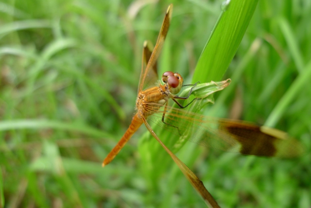 畑に行く途中、羽の柄の目立つトンボを見つけました。飛んでいるときにヒラヒラと羽の柄が注意を引きます。あまり見ないトンボだなと思っていると、しばらくして草むらにとまりじっーとしているので、これはと思い撮影してみました。なかなかいいモデルさんです。接写もさせてくれました。ミヤマアカネって言うらしいです。オスはもっと赤くなるのでメスのようですね。
