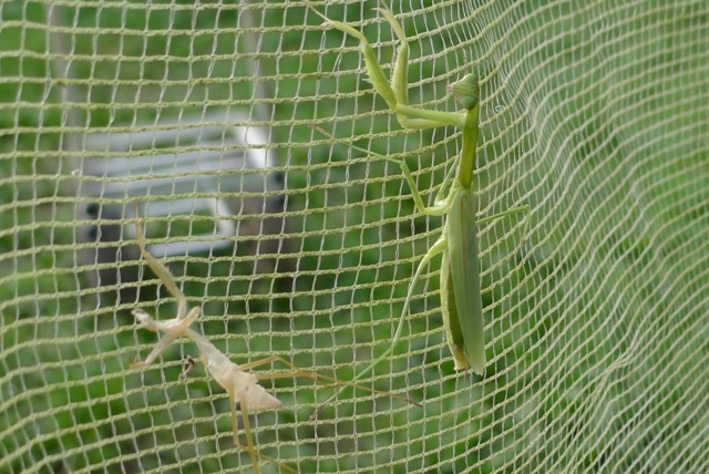 カマキリが防虫ネットのところで脱皮していました。羽が大きく広がっています、最終形態です。ちなみに抜け殻は羽が畳まれた状態で、ヤゴや、蝉のそれに似ている、当然、羽が大きく広がれば多少の飛行はできるから、この場合、羽化というべきなのだろうか、もう少し早く見つけていれば脱皮(羽化)の瞬間も見れたのに残念でした。