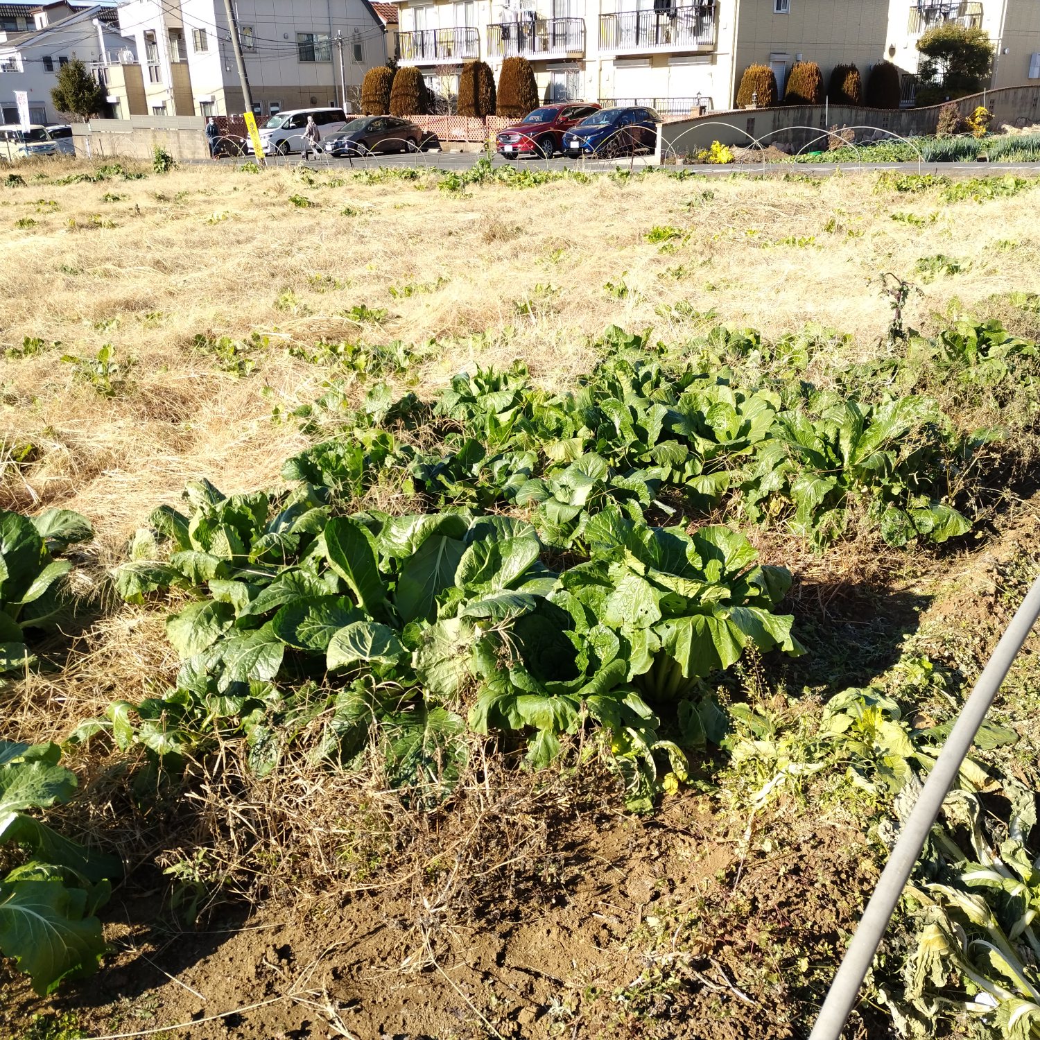 休耕畑では、おそらく白菜であろう植物が自生しています