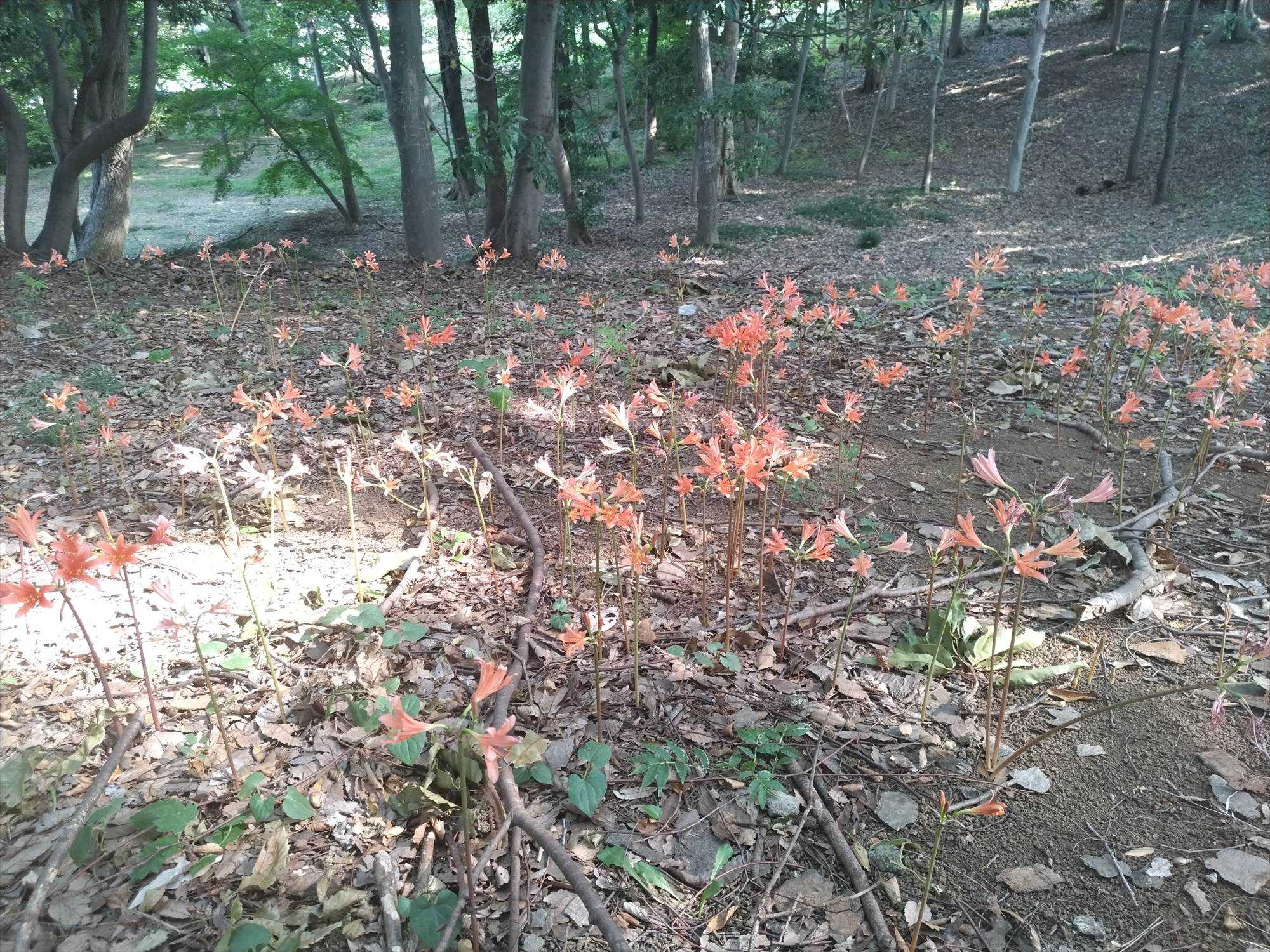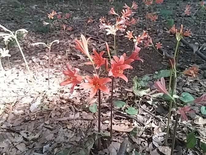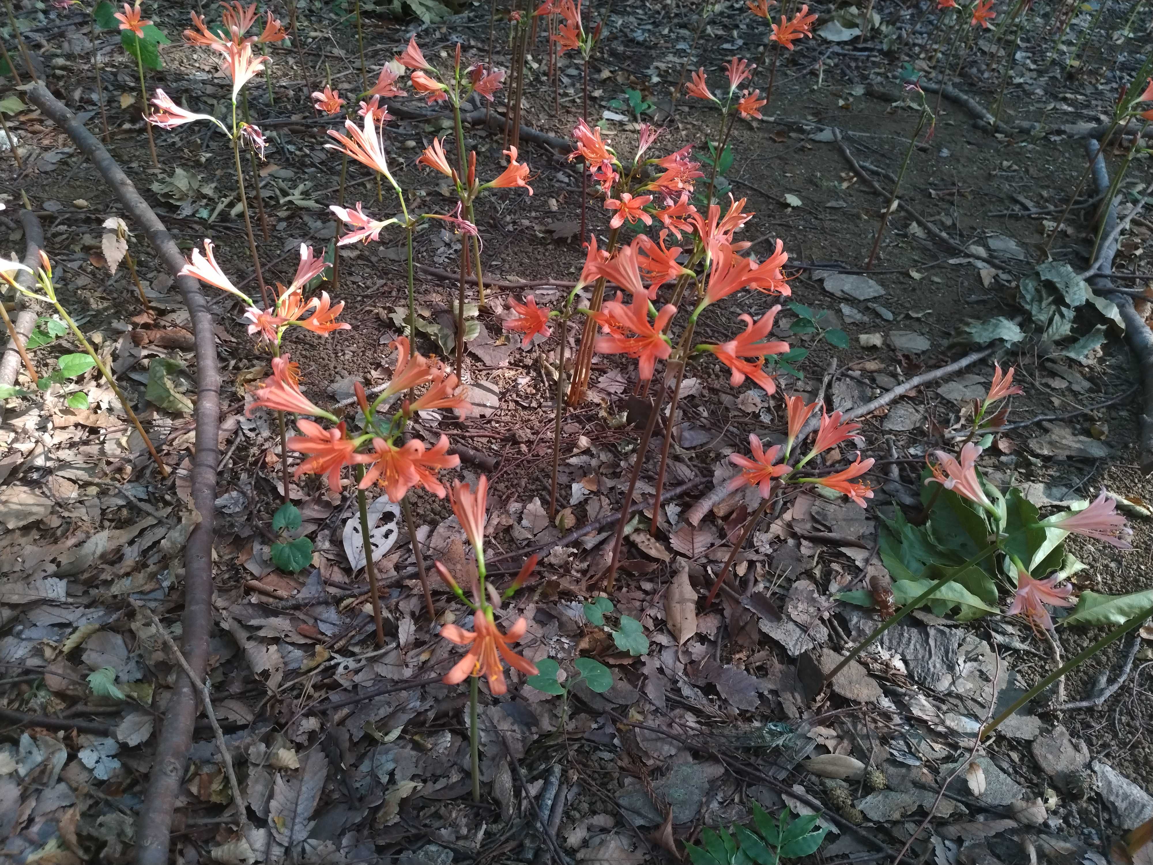 ヒガンバナ科ヒガンバナ属の多年草で、夏(7月?9月頃)に林の中や半日陰の斜面などでよく見られます。特徴としては細長いオレンジ色の花びら葉は春に出て夏前には枯れ、花だけが夏に咲く群生して咲くことが多いといった点があります。この写真のように雑木林の林床に群生して咲いている光景は、キツネノカミソリの典型的な自生環境です。
