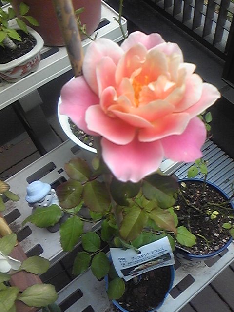 新しいバラを2鉢買いました!上の写真がディスタントドラムスで下の写真がジュビレデュプリンセスドモナコです。ディスタントは西武ドームのバラとガーデニングショウで見たものと同じ種類を探して購入しましたお花は癒されます。きなこ程ではないですが