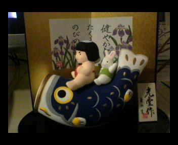 きなこは男の子。もうすぐ端午の節句です!本当は金太郎さんが鯉にまたがっていてその後ろにうさちゃんがいた陶器の置物を買おうとしていたんです。いざ買おうとしたら売りきれ・・・。仕方なく形だけはと思いお菓子売場にあった風車と鯉のぼりのついたお菓子をかいました。きなこに見せたけど??かじって確認。わかってないでしょーね。家の父親は黒ちゃ~んて何回も見せてたけど。何回きなこだよと言ってもくろちゃんだと名前を勝手に変えてるんです。きなこがわからなくなっちゃう。でも最近はき~なちゃんとかきーちゃんとかきーって言うだけで反応するんです。結局わかってないのかも・・。でも片目がほとんど見えてない為音には他の子よりも敏感かもしれません。病院へ行っても最初は光に反応もしなかったのが最近は先生のライトに目が反応するようになったんです。とは言ってもやはりちゃんとは見えてないかもしれません。うさぎさんは元々視力に頼る動物ではないそうです。嗅覚・聴覚で動いてるんです。いつも通っている動物病院の先生には頼りきっています。何ていっても今きなこが元気にしているのは先生のお蔭ですからね。