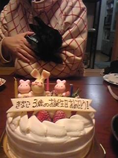 今日は久々のブログ更新。きなこの3歳のお誕生日なんです!注文しておいたケーキと共に記念撮影黒いから黒の塊にしか見えないか・・。本人はちょっと迷惑そうだったけどEZを発症して2年半・・。お目めは見えてないかもしれないけど元気に走り回っている姿を見ると3歳を迎えられたなんて本当に嬉しいです。プレゼントにはケージから出る時のステップと生牧草です最近写真がbmpになってしまって変換するのによくわからずブログが出来ませんでしたPC得意ではないんで・・。今年に入ってからも夫婦共に体調が悪く色々大変なうさママですがきなこと共に頑張っていこうと思います。ちなみに今外国にいる主人も今日誕生日です。二人ともお誕生日おめでとう