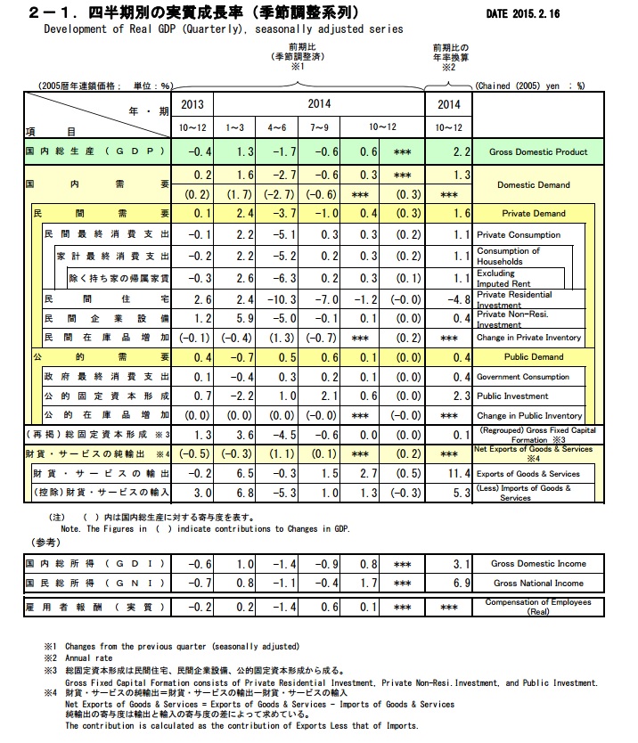 ★内閣府から16日に発表されたGDPのQE(速報値)を見てみよう。・・・ 実質季節調整済みのGDP速報値では、2014年10-12月には0.6となり、昨年同月期から▲0.4→1.3 →▲1.7→▲0.6→0.6と、1-3月期の消費税引き上げ前の駆け込み需要から、一旦大きく落ち込んだ後、回復しつつあるように見える。しかし、まだ回復という段階にまでは脱してはいないようだ。 昨年の1-3月期の「+1.3」という増加率は、4月の消費税率引き上げが、駆け込み需要となったためであろう。4-6期には反動落ち込みが顕著に見られる。7-9期以降は、外需については円安での輸出ドライブ、昨夏からの原油安で輸入が抑制されていることもジワジワと改善方向に向かう、大きな要因ではなかろうか。需要項目別の動向でみてみる: ・民間最終消費需要は、▲0.1→2.2→▲5.1→0.3 →0.3と、GDPと似た動きである。 ・民間住宅投資は2.6 →2.4→ ▲10.3 →▲7.0→▲1.2と、駆け込み需要以後は、消費増税により生活費の増嵩で、住宅建設意欲も大きく落ち込み、また、東北大震災後の資材不足、人手不足などで建築費が増嵩し、住宅建築意欲は高まらず、低調である。住宅建築は借入金が資金調達の大勢を占めるが、このような超低金利時代でも住宅建設の意欲が高まらないのは建築費の高止まりと、社会環境の不安定化などが原因かも知れない。 ・民間設備投資は 1.2→5.9→▲5.0→▲0.1→0.1と、駆け込み需要後の落ち込みからは戻っているが弱い回復である。ただ、円安で、国内生産の意欲も再び生まれつつあり、弱いながらも回復の兆しが見えるようだ。 ・民間在庫品増加は▲0.1→▲0.4→1.3→▲0.7→0.2 これは意図した在庫なのか、残渣なのかが判らない。消費増税を見越して在庫品は少なくなり、増税後は売れなくなり余っただろう。在庫調整期間を経て、少しだけ積み増ししているのかも。 ・公的最終消費支出は0.1→▲0.4→0.3→0.2→0.1 とほぼ微増を維持している。 ・公的資本形成0.7→▲2.2→1.0→2.1→0.6 増加を意図していても、資材・人材不足などのために実地においては資本形成が遅れがちである。 ・輸出は▲0.2→6.5→▲0.3→1.5→2.7円安環境から、輸出には好条件となっている。 ・輸入は3.0→6.8→▲5.3→1.0→ 1.3国内の駆け込み需要を反映した反動で、4-6月は減少し、それ以後は原油安で抑制の効果もあり低位に留まったようだ。以上は、呆け頭の感覚である。★ 以下に、GDP速報値2014年10-12期を掲載する。 <内閣府 経済社会総合研究所 国民経済計算部 のホームページから>http://www.esri.cao.go.jp/jp/sna/data/data_list/sokuhou/gaiyou/pdf/main_1.pdf ★