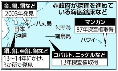 ★尖閣諸島や沖縄列島周辺を中国政府が航空機や、巡視船で探査し、小笠原諸島まで中国漁船が赤珊瑚などを狙って進出している。★あれだけ広大な領土を持つ中国であるが、領土内の地下資源よりも、南シナ海、東シナ海などの海底資源に注目しているのは間違いないであろう。★中国は、大陸からの出口を求めて海路を確保する動きにみえるが、むしろ領海をできるだけ広く宣言することで海底資源を確保する意識がみえみえである。スプラトリー諸島の埋め立てや、ヴェトナム沖、尖閣沖などでは資源確保の準備運動が始まっているのかも。★ WIKIPEDIAなどで「日本の海底資源」の項をみてみたい。推定資源推定埋蔵量→回収可能量推定製品価値 海底熱水鉱床 約200ヶ所 7.5億トン→4.5億トン メタル量1.7億トン 地金価値80兆円(47万円/t) コバルト・リッチ・クラスト 約5万平方km 24億トン→11億トン メタル量2.2億トン 地金価格100兆円(45.5万円/t) メタンハイドレード 約5万平方km 12.6兆立方m→4.1兆立方m メタンガス120兆円相当 LNG換算 海底資源海域について資源域確認済み探査中 沖縄トラフ 海底熱水鉱床 伊豆・ 小笠原海域 海底熱水鉱床 南鳥島周辺海域 コバルト・リッチ・クラスト(レアアース) 渥美半島・ 志摩半島沖 メタンハイドレード(→天然ガス) 佐渡沖 石油・天然ガス 沖縄本島沖 レアメタル 久米島沖 海底熱水活動域(チムニー破片) 沖ノ鳥島沖 レアメタル 岩船沖油ガス田 原油:101千kl/年 天然ガス196百万立方m/年 国連に認められた「四国海盆海域」、「小笠原海台海域」、 南硫黄島海域」、「沖大東海嶺南方海域」 の日本の大陸棚は 日本国土の約8割に相当する面積をもっており、 海底資源(レアメタル、コバルトリッチクラスト、メタンハイドレード)が眠っている可能性が大きい。 ★ 海底鉱床探査 :(読売新聞しらべ) ★