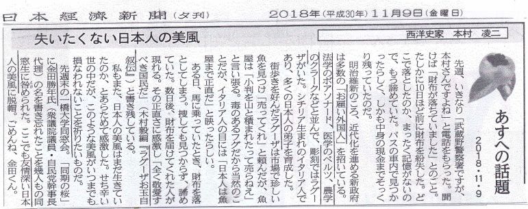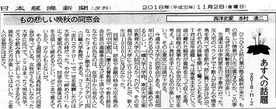 ☆賢明なる諸兄へ Mr.Tsunami 前略 本村 凌二 教授(1973年 一橋大学社会学部卒 →東京大学大学院卒)は11月9日の日経夕刊コラム「あすへの話題」で(「失いたくない日本人の美風」 について語られた後)末尾にて、一橋大学1973年同期卒業生「金田 勝年氏(経済学部荒ゼミ)」のことについて、11月2日のコラム(下記)で触れなかったことを詫びています。 既に読了済みとは思いますが、念の為、ここもと添付送信します。 以上、余談まで。 草々☆めいてい君の追加(めいてい君のブログ Nov.4 2018 を参照ください) WIKIPEDIAから抜粋・本村 凌二 氏:(もとむら りょうじ、1947年5月1日 - ) 石原裕次郎のファンであり、 2017年に関連する著書を刊行した。<11月2日に触れた錚々たる同期生>・竹中 平蔵 氏: (たけなか へいぞう) 大学では国際経済学の山澤逸平ゼミに所属・進藤 孝生 氏: (しんどう こうせい、1949年9月14日 - )・山本 コウタロー 氏:(本名:山本 厚太郎 やまもと こうたろう、 1948年9月7日 - ) は、日本の歌手、タレント、白鴎大学教授。 オフィスプロフィット所属。東京都千代田区出身。 芸名は山本コウタロー(コータローではない)だが、 作曲や大学で教鞭をとるときは本名の山本厚太郎名義 で行っている。 千代田区立麹町中学校、東京都立日比谷高等学校、 一橋大学社会学部卒業。 白鴎大学特任教授。学生から講義の人気は高く抽選科目である。 上智大学法学部に入学。上智大学在学後も東京大学受験を志すも 東大紛争による東大入試中止により一橋大学社会学部に転学。 大学在学中からフォーク・グループソルティー・シュガーの メンバーとして活動。 日本におけるコミックソングの代表作のひとつともいえる 「走れコウタロー」を1970年にリリース。 その面白さから第12回日本レコード大賞新人賞を受賞する ヒットソングとなった。 1971年ソルティー・シュガー解散後、高田渡、シバらとともに 武蔵野タンポポ団のメンバーとして、 中津川フォークジャンボリーに参加。 この頃からなぎらけんいち(現:なぎら健壱)らと親交を持つ。 1972年大学卒業。卒論は「誰も知らなかったよしだたくろう」 という題名だった。<11月9日で触れる錚々たる同期生>・金田 勝年 氏: (かねだ かつとし) 一橋大学経済学部で荒憲治郎教授のゼミに参加。1973年、大学を卒業し、旧大蔵省(現:財務省)に入省。大学及び入省同期に佐藤隆文(元金融庁長官)。伊藤隆敏(コロンビア大学教授)は荒ゼミの同期。☆