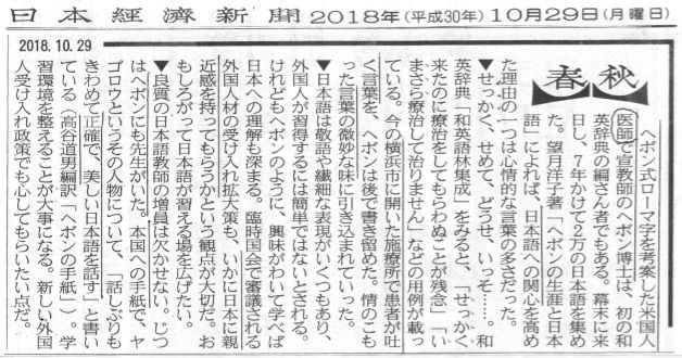 ☆賢明なる諸兄へ from Mr.Tsunami 前略 日経朝刊コラム「春秋」に「ヘボン式ローマ字」を考案したジェームズ・カーティス・ヘボン(James Curtis Hepburn1815~1911)長老派教会・医療伝道宣教師のことが紹介されており、文中、ヘボンの研究家「高谷 道男氏(明24~平6、102歳白寿会員:大正4年東京高商卒)」にも触れていますので、既に読了済みとは思いますが、念の為、ここもと添付送信します。 ネット検索によると高谷氏は、東京高等商業学校在学中、内村鑑三(1861~1930)の門下「白雨会(ムラサメカイ:明治45年発足)」に入会したそうで、この白雨会(ムラサメカイ)は、第一高等学校・東大・慶大・一橋大の学生を中心に、無教会派の学生によって組織されていた由。 卒業後シカゴ大に留学。 関東学院大・明治学院大の教授を経て桜美林大学「経済学部」創立に尽力、同大経済学部長も勤められた、とのこと。 以上、雑談まで。 草々☆・付属説明(WEBから・・・めいてい君の追加)・ヘボン式ローマ字・無教会主義 (WIKIPEDIA)無教会主義(むきょうかいしゅぎ)は、内村鑑三によって提唱された日本に独特のキリスト教信仰のあり方で、プロテスタントの精神を継承していると主張する(聖礼典であるプロテスタントの洗礼・聖餐などのサクラメントと教会制度の必要性を認めないことから通常はプロテスタントでないキリスト教に分類される)。英語では、Non-church Movementと表記する。無教会、無教会キリスト教、無教会主義キリスト教とも呼ばれる(信徒のあいだでは「無教会」と呼称されることが多い)。なお、「無教会派」という名称は通常ない。・長老派教会 (WIKIPEDIA)長老派教会(ちょうろうはきょうかい、英語: Presbyterianism, Presbyterian Church)は、キリスト教のプロテスタント、カルヴァン派の教派。長老教会、長老派とも訳される。・ヘボンの医師の専門分野 眼科・番外 めいてい君には「ヘボン」の名は 聞いたような名である。 英国人で米国女優Audrey Hepburn:WIKIPEDIA☆