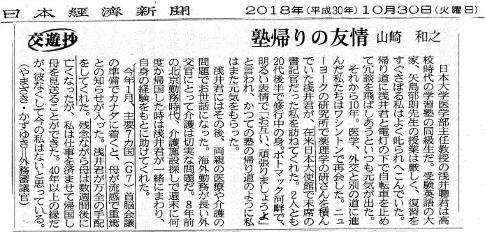 ☆賢明なる諸兄へ from Mr.Tsunami前略 日経朝刊「交遊抄」に、 山崎 和之氏(一橋大学1983年卆、外務省入省)が (親友の浅井 聡医師との交友録を) 寄稿されていますので、既に読了済みとは思いますが、 念の為、ここもと添付送信します。 山崎さんにおかれては、 今年1月、カナダで開催される主要7ヵ国首脳会議の 準備のため現地に渡航中(*)に、 ご母堂様が発病され数週間後に逝去された由。 哀悼の意を表したいと思います。 草々・参考資料(*)<めいてい君のブログ>Jun 18, 2018 Dr.Tsunamiの特別寄稿:首相官邸のフェイスブック「漂流G7 ネット戦の裏側」について(ご参考)・山崎 和之氏 (WIKIPEDIA抜粋)経歴・人物1960年(昭和35年)東京都出身。桐蔭学園高等学校を経て、1982年(昭和57年)10月一橋大学経済学部在学中に外務公務員採用上級試験に合格する。荒憲治郎ゼミ出身。1983年(昭和58年)一橋大学経済学部を卒業して、外務省に入省した。北米局北米第1課長、外務大臣秘書官、国際報道官、大臣官房総務課長、内閣総理大臣秘書官、在アメリカ合衆国日本国大使館公使、在中華人民共和国日本国大使館公使、総合外交政策局参事官〔大使〕、同審議官、内閣官房審議官・国家安全保障局内閣審議官を経て、2015年(平成27年)10月から外務省大臣官房長兼国家公務員共済組合連合会理事。2016年(平成28年)兼監察査察官事務代理[。2017年(平成29年)7月14日から外務審議官(経済担当)を務め、日中韓自由貿易協定交渉に日本側首席代表として参加するなどした。2018年(平成30年)の第44回先進国首脳会議では、アンゲラ・メルケルドイツ首相がInstagramに投稿した写真に写り込み話題になった。・浅井 聡教授 (日本大学医学部医学科薬理学 kenkyu-web.cin.nihon-u.ac.jp/)☆