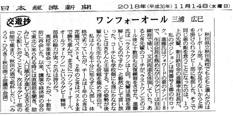 ☆賢明なる諸兄へ from Mr.Tsunami 前略 本村 凌二教授(1973年 一橋大学社会学部卒 →東京大学大学院卒)は、11月2日・9日両日の日経夕刊コラム「あすへの話題」にて多士済々の一橋大学1973年卒業同窓生に触れていますが、そのなかの一人「進藤 孝生 新日鐵住金社長」について、秋田商工会議所会頭 三浦 廣巳氏が14日の日経朝刊「交遊抄」のなかで触れていますので、既に読了済みとは思いますが、念の為、ここもと添付送信します。 草々☆<めいてい君の追加>1.進藤 孝生(しんどう こうせい)氏 新日鐵住金社長就任時(日刊工業ビデオニュースから)2.秋田商工会議所 会頭 三浦 廣巳氏(秋田商工会議所のホームページから、 広巳→廣巳に訂正しました。)☆