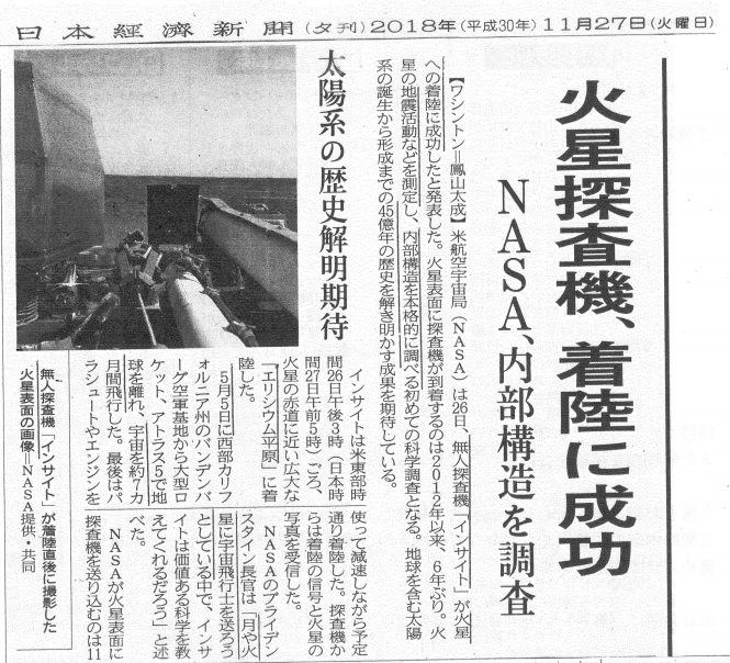 ☆賢明なる諸兄へ from Mr.Tsunami 前略 野次馬 根性で恐縮ですが、 日経新聞に、普段、われわれが めったに目にしない 画像が2件、掲載されていましたので、 既にお目通しとは思いますが、 ここもと、添付しました。 1ツは、 地球の兄弟星のような 火星表面のパノラマ写真 by 「InSight(インサイト) 」 もう1ツは、 日産のカルロス・ゴーン会長が 収監されている 東京拘置所内部の写真 です。 ゴーン会長は、保釈金を払えないのでしょうか、 それとも払わない積りなのでしょうか?…。 以上、余談まで。 草々☆・・・・・・・・・・・☆<「めいてい君」が「画像拡大/追加」します>☆(カラー化:https://www.nikkei.com/) 火星の大気よりも地面をご覧くださいね!(無人探査機「インサイト」が着陸直後に撮影した 火星表面の画像=NASA提供・共同)(6月に報道公開された東京拘置所の単独室 :日本経済新聞) ☆<インサイト:WIKIPEDIA>☆「Dr.Tsunamiの問いかけ」への返事は今夜のシンデレラタイム以降とします。 めいてい君☆