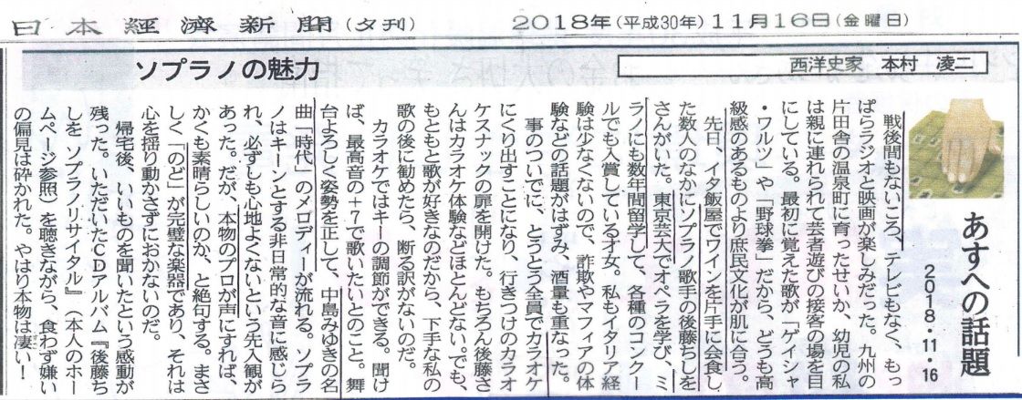 ☆賢明なる諸兄へ from Mr.Tsunami 前略 日経夕刊コラム「あすへの話題」にて 本村 凌二 教授(1947年生まれ、 1973年 一橋大学社会学部卒→東京大学大学院卒)は、 ソプラノ歌手「後藤 ちしを」女史 とカラオケに 同行したことを書いています。 ・・・・・・・・・・・・・・・・・・・・ なんだか我々が大学でゼミの散会後に、 カラオケに流れたみたいですネ! その節は、美声のバリトン歌手 故人のゼミテンT.T.にも参加してもらいたいもの… ・・・・・・・・・・・・・・・・・・・・ 後藤 ちしを 女史の略歴を別添しましたが、 ネット検索によると、 東京藝術大学大学院修士課程オペラ科修了後(第13回 北海道国際音楽交流協会 HIMES 音楽コンクール声楽部門 第1位にて) 2001年(平13年)にオーストリア・ウィーン留学。 2003~09年、ミラノ音楽院にて研鑽を積む。 2011年(平23年)に帰国された由。 本村教授にとって後藤さんは、 娘みたいな存在でしょうか?…。 既に読了済みとは思いますが、 念の為、ここもと添付送信します。 以上、余談まで。 草々 ☆<めいてい君の追加>・・・見辛い方のために・・・明日への話題(本村 凌二)「ソプラノの魅力」・・・・・・・・・ 本村 凌二 氏は「石原裕次郎」のフアンと公言しているからカラオケは得意であろう。 天才的だったゼミテンT.T.の歌唱力はレイチャールズ そっくりだった「 I Can't Stop Loving You 」を堂々と並み居る聴衆の前で歌ったことで証明できる。 たしか、彼T.T.が商社の米国駐在員だったころに、NHK海外番組「米国カラオケ紅白歌合戦?」で歌い、ゼミの恩師と小生はTVで見たのだがWEBで探しても見つからない。 「シカゴ」辺りだったと思うが・・・ ・・・めいてい君。☆