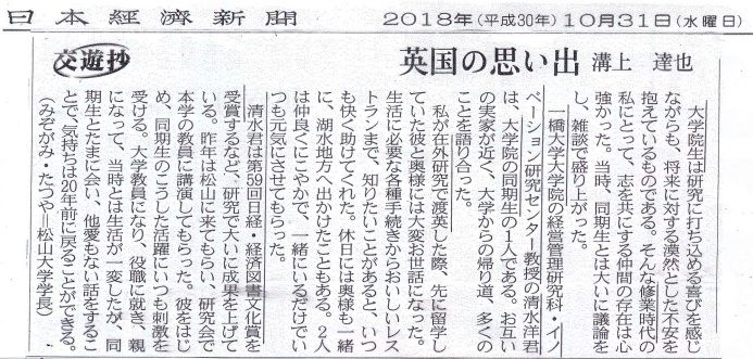 ☆賢明なる諸兄へ Mr.Tsunami 前略 日経「交遊抄」にて、 松山大学・溝上 達也 理事長・学長 (1974年山口県生~:1997年一橋大学商学部卆、 1999年一橋大学大学院商学研究科修士課程修了 2003年一橋大学商学博士取得)が「英国の思い出」と題し、 一橋大学大学院の同期生 清水 洋 教授 (1973年横浜市生~:1997年中央大学商学部卆、 1999年 一橋大学大学院商学研究科修士課程修了、 2007年 ロンドン・スクール・オブ・エコノミクスで Ph.D経済史、 2017年 一橋大学大学院商学研究科 イノベーション研究センター教授) との交友に触れています。 ネット検索によると、 別添のように両人とも40歳代半ばで、 我々後期高齢者とはほぼ1世代30年の違い…。 今後、大いなる活躍の期待される 若い(?)研究者です。 以上、世代交代の雑感まで。 草々(大学案内)から(WIKIPEDIAなど)////////////////////////// /////////////☆<めいてい君の追加>・英国湖水地方阪急交通社http://www.hankyu-travel.com/guide/uk/lakedistrict.php・英国留学生のブログから抜粋https://ayakooxfordtravel.wordpress.com/桂冠詩人:ワーズ・ワース関連風景(グラスミア)☆
