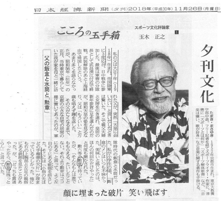 ☆賢明なる諸兄へ from Mr.Tsunami 前略 夕刊文化欄コラム「こころの玉手箱」に スポーツ文化評論家 玉木 正之 氏(1952年・昭和27年生れ~、 東京大学教養学部中退)が、 氏の父(1918年・大正7年生まれ) の戦時下の経験を 追想していますので、 読了済みとは思いますが、 念の為、ここもと添付送信します。 この追憶をもって 「戦争はイカン!」と断言出きるかどうか、 判断しかねますが、 いずれにせよ戦時中 いかに「非日常が常態」であったか、 断言できそうです。 戦時中の名付で「満」という名前があるのは 「お前を 満州 に送るためだ!」、とか…?。 以上、蛇足です。 草々☆<めいてい君の追加>読み辛い方に拡大、一部カラー化する。(日付は省略。) (カラー化:https://www.nikkei.com/)☆