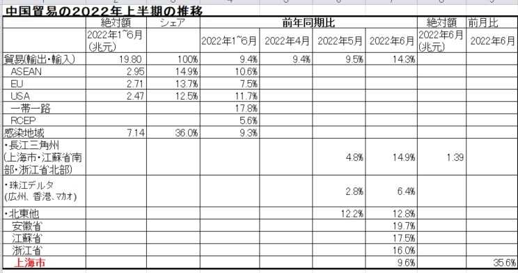 中国上半期の貿易と実質GDP1.上半期の貿易http://www.gov.cn/xinwen/2022-07/13/ content_5700802.htm コロナ禍での上海~西安のロックダウンなどで 貿易は逼迫から回復途上・・・ 世界的なサプライチェーンの行き詰まり、資源・食料の 囲い込みが伝染しており~世界の調和が損なわれつつある。 まずは、世界の調和を壊しているロシアのプーチンを 糺さなければならないかもしれない。 BRICsとはChinaを除くothers。つまり、ブラジル、ロシア、インド、南アフリカを指す。2.上半期の実質GDP(単位:億元、億米ドル)http://www.gov.cn/xinwen/2022-07/15/ content_5701194.htm 中国の2022年上半期の実質GDPの成長率は「2.5%」で、第1四半期は「4.8%」、第2四半期は「0.4%」と、とても目標値の「5.0%」には届かない状態です。 中国経済では第1次産業よりも第2次産業が、第2次産業よりも第3次産業が、特に酷い影響を受けているようだ。 世界的なインフレ傾向(ロシア・プーチンのウクライナ侵攻が契機)、と新型コロナウイルスの亜種による感染の延長などから、世界的に貿易縮小、成長率ダウンなどが発生しています。 赤字は標記のモノを写している。 中華中央人民政府の「宏观经济运行情况」のGDPの成長率とは一致しない。 理由はいまのところ小生には判らない。3.讀賣新聞夕刊による中国GDP成長率(前年同期比) の四半期別推移★ JETROビジネス短信の追加 (2022年7月20日)★