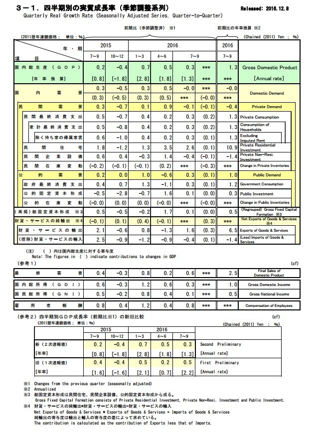実質四半期率GDP FY2015.7~9期からFY2016.7~9期 2次速報値