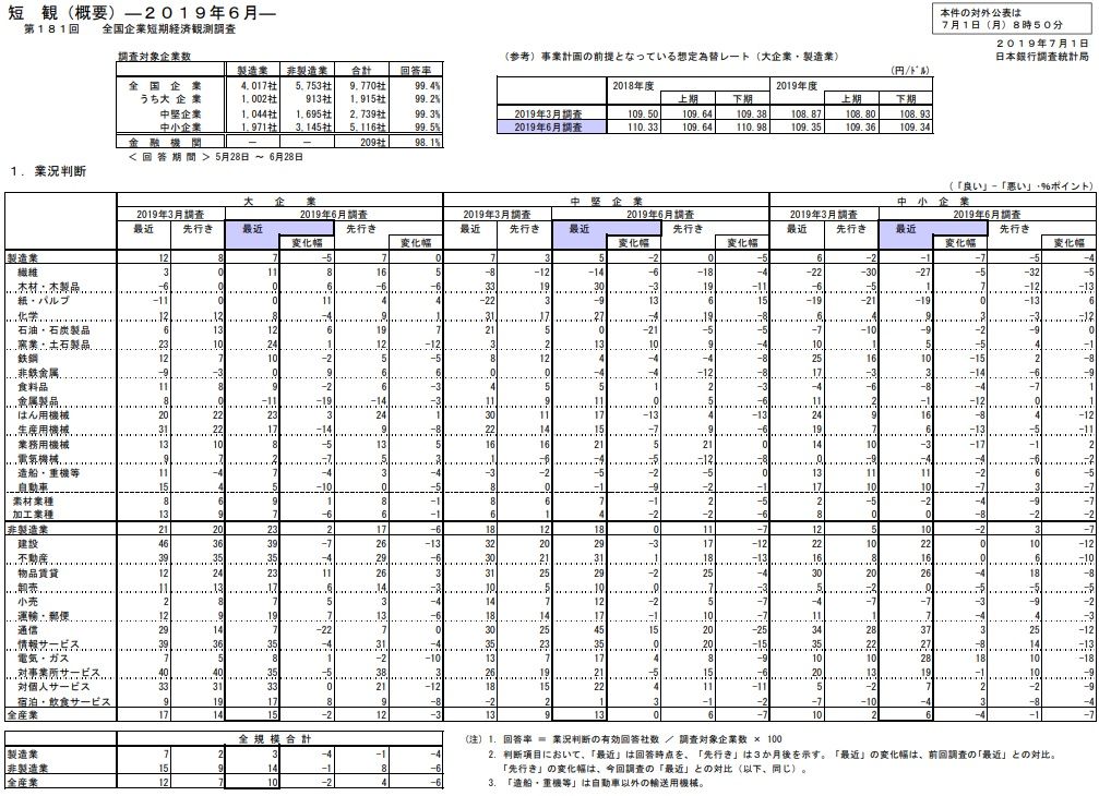 日本銀行調査統計局の短観(概要)2019年6月 から。​
