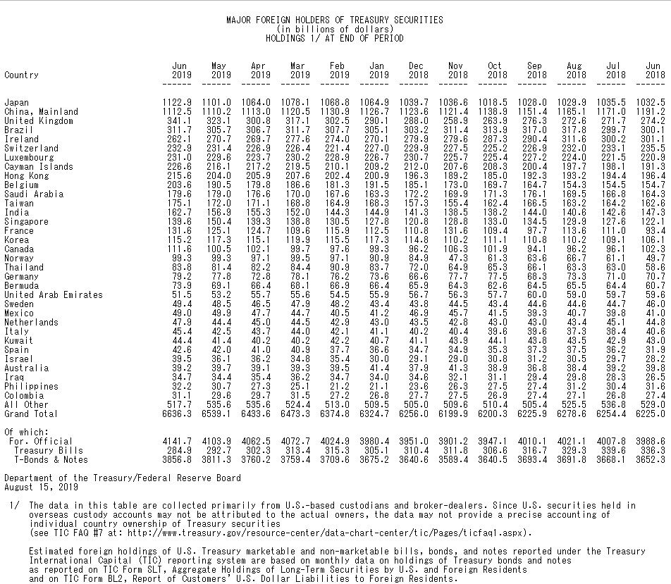 中国はピークの2017年8月から 892億ドルも減らしている。