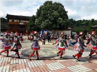 村の広場で、苗族の踊りを見物する団体客の中に、