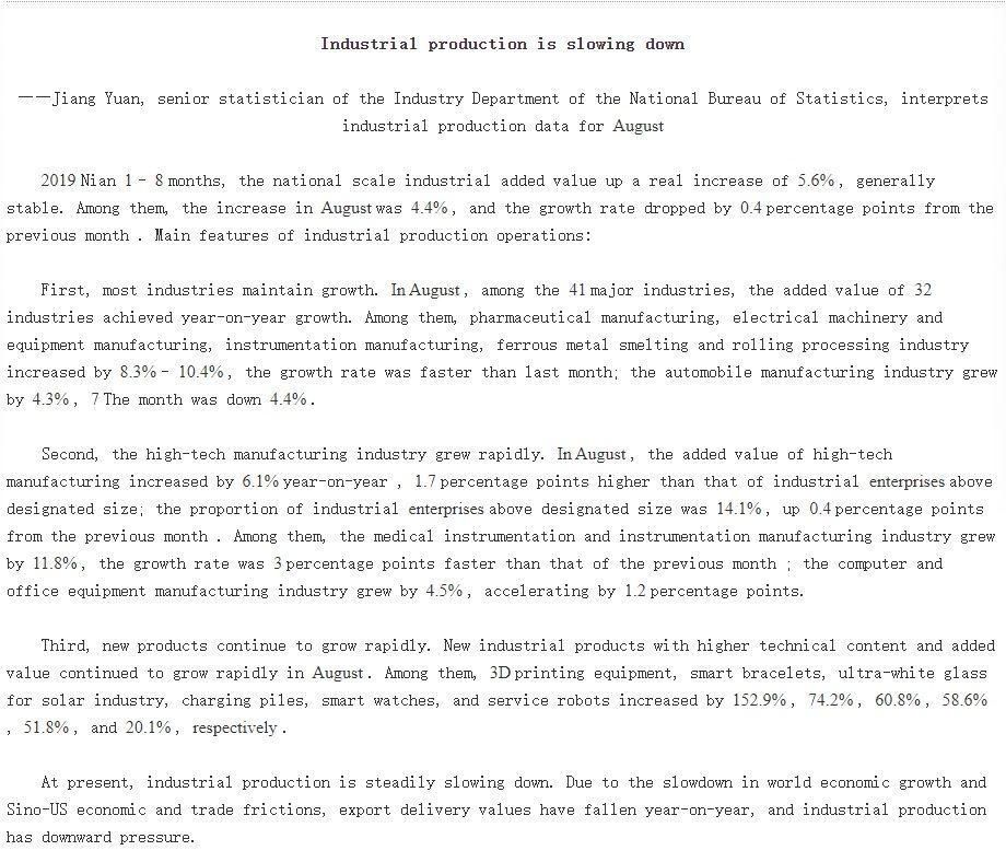 2019年8月の工業生産は前年同月比4.4%増えた。
