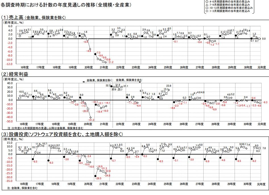 当初の当年度見通し(1~3月期時点:「●」)について、