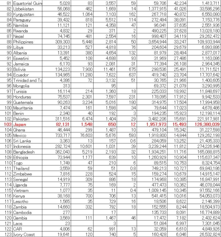 PCR検査率が世界的に低いこと、