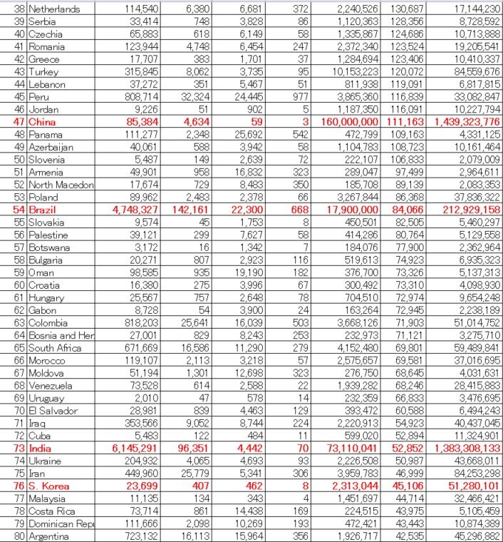 ​絶対量の感染者数​ は、 一位の米国が 736万人 であるが、