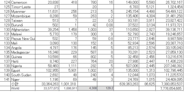 人口1百万人以上の国々 ​141ヶ国の小計は​