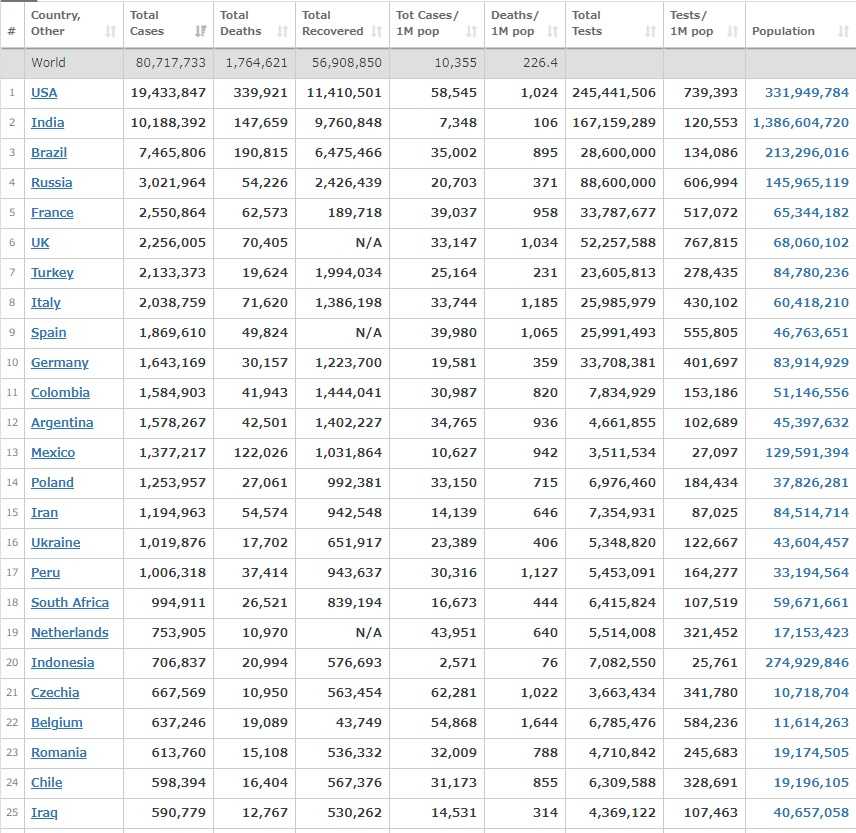 上位国  感染者    死者    回復者    感染者/M 死者/M PCR    PCR/M 人口