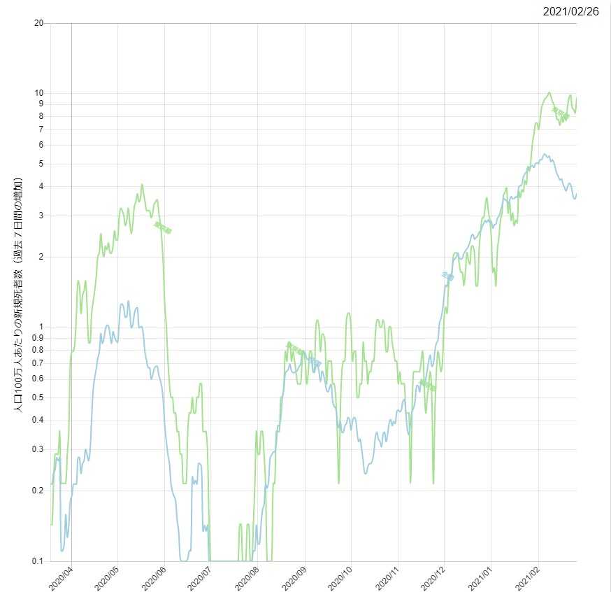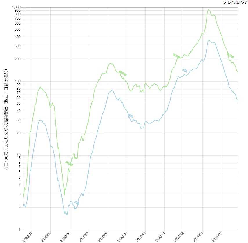 明らかに、「 7日間の新規感染者数/人口百万人 」は