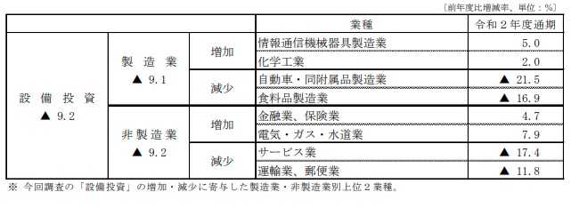 2020年度の設備投資投資額の伸びと業種別の寄与度は;