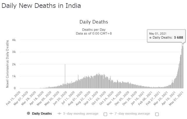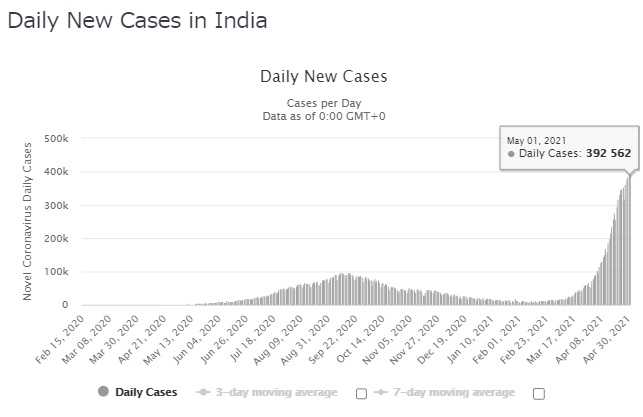 インドの直近1日May1,2021の新規感染者は392.6千人、