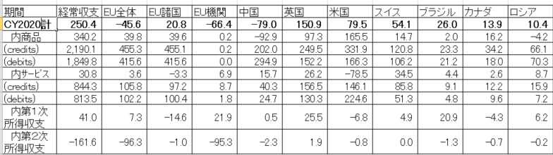 ​2.EUの対外主要国別経常収支CY2020(単位:10億€)
