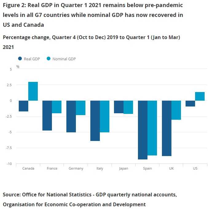 各国別の実質・名目値での2019年Q4から2021年Q1