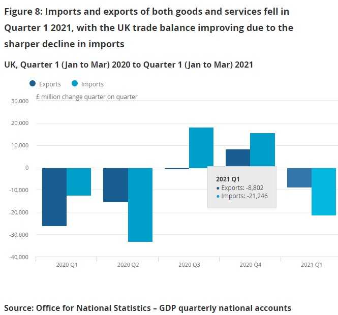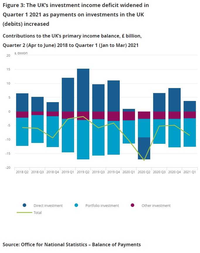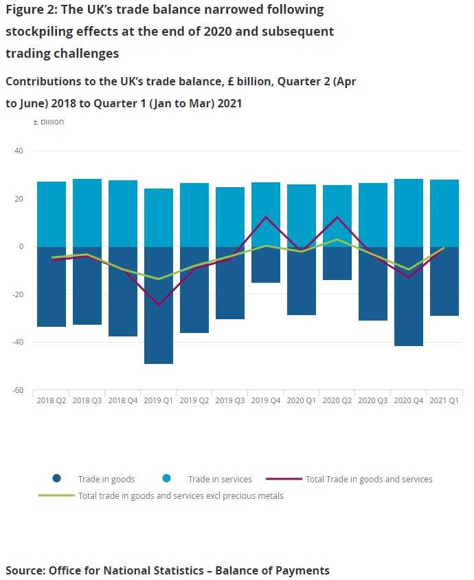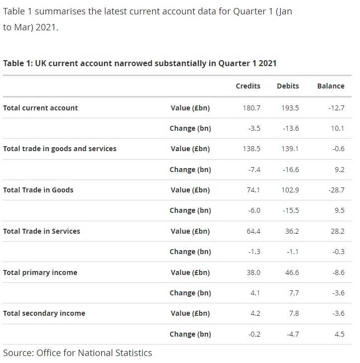 (1)2021年Q1経常収支の各項目(百万£、%)