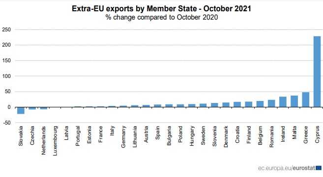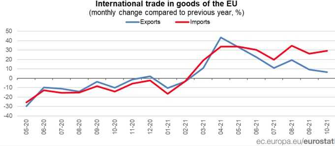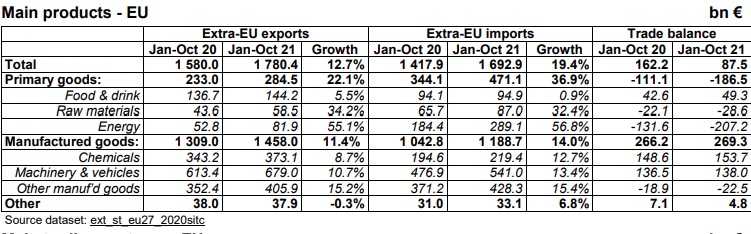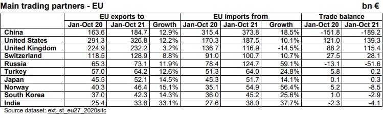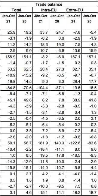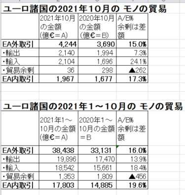 2021年1~10月の「域外の貿易黒字」は「EA」では「1,353億€」、