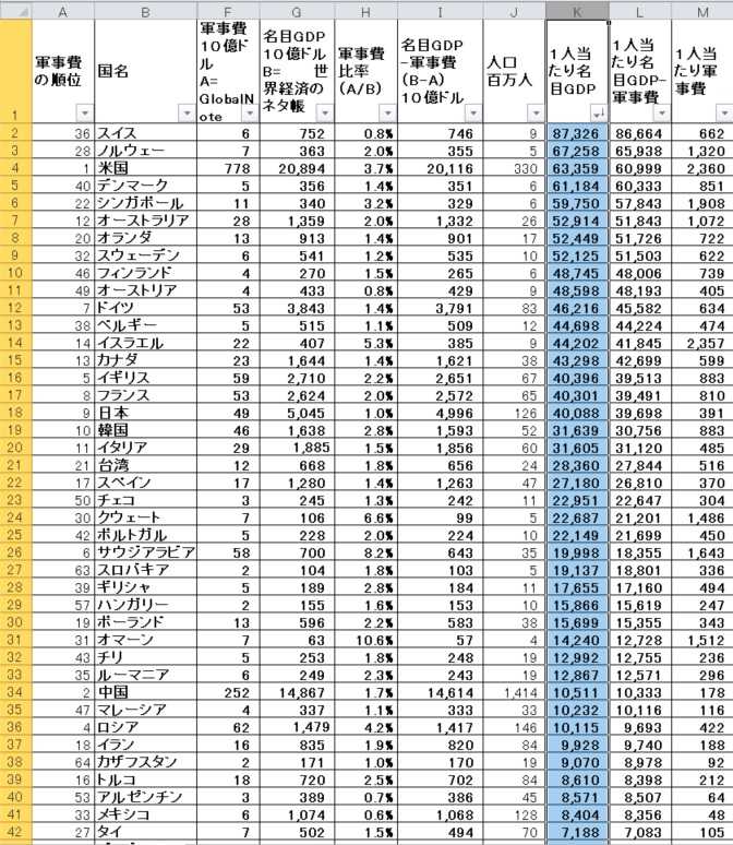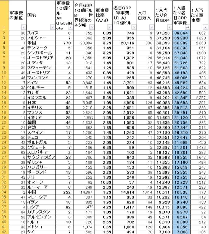 スイスでは2020年の年間で1人当たりGDPで軍事費