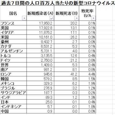 人口当たりで見ると感染者は英、米、仏が最も多い。