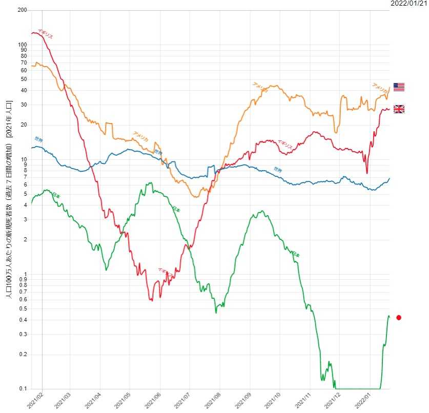 ​​の 「人口百万人当たりの過去14日間の新規死者の増加」 を見る。