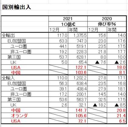 2021暦年でみると、輸出は1兆3,755億€、