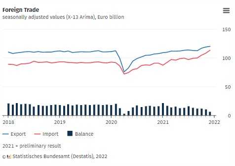 ​ モノの貿易収支(差額)は、2021年12月には70億€であり、
